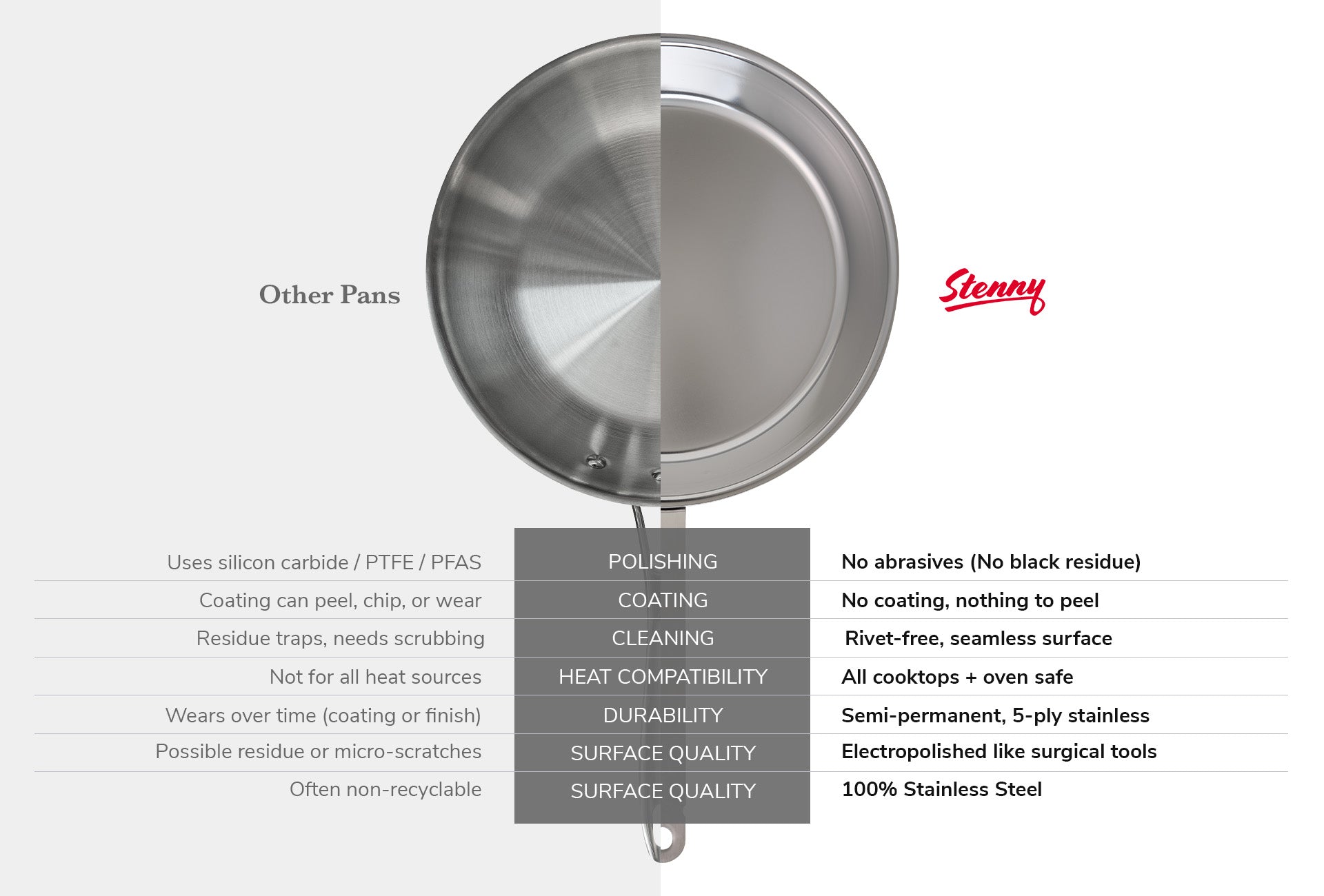Traditional stainless cookware uses silicon carbide—a Group 2A carcinogen—to polish the surface. Stenny skips abrasives entirely.